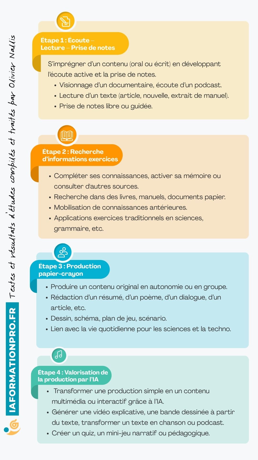 Les élèves produisent un contenu valorisable et partageable. On retrouve une implication cognitive, appuyée sur la lecture et l’écriture. Le support produit plus engageant et agréable à consulter. L’enseignant les forme incidemment à l’IA